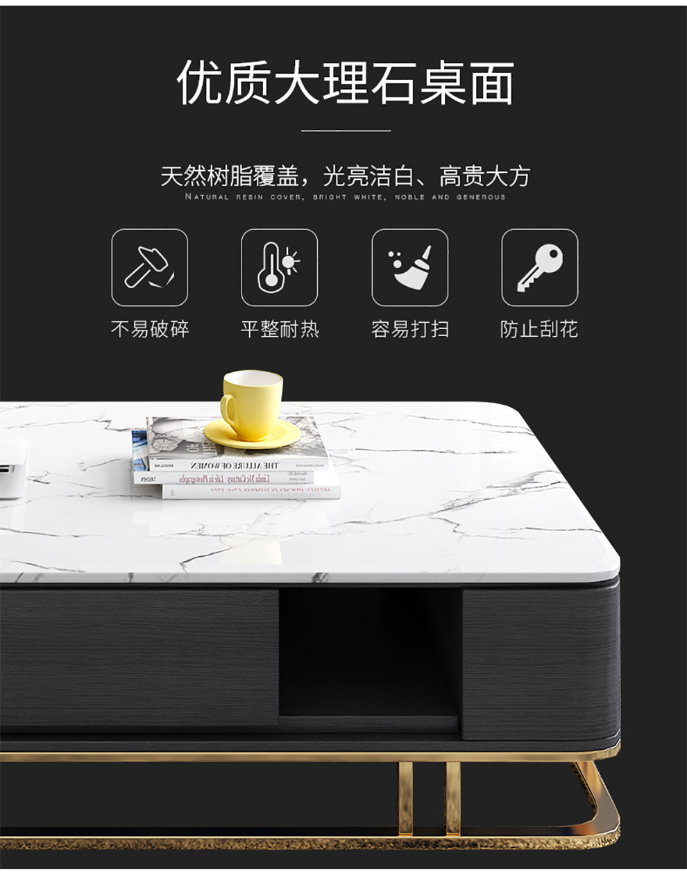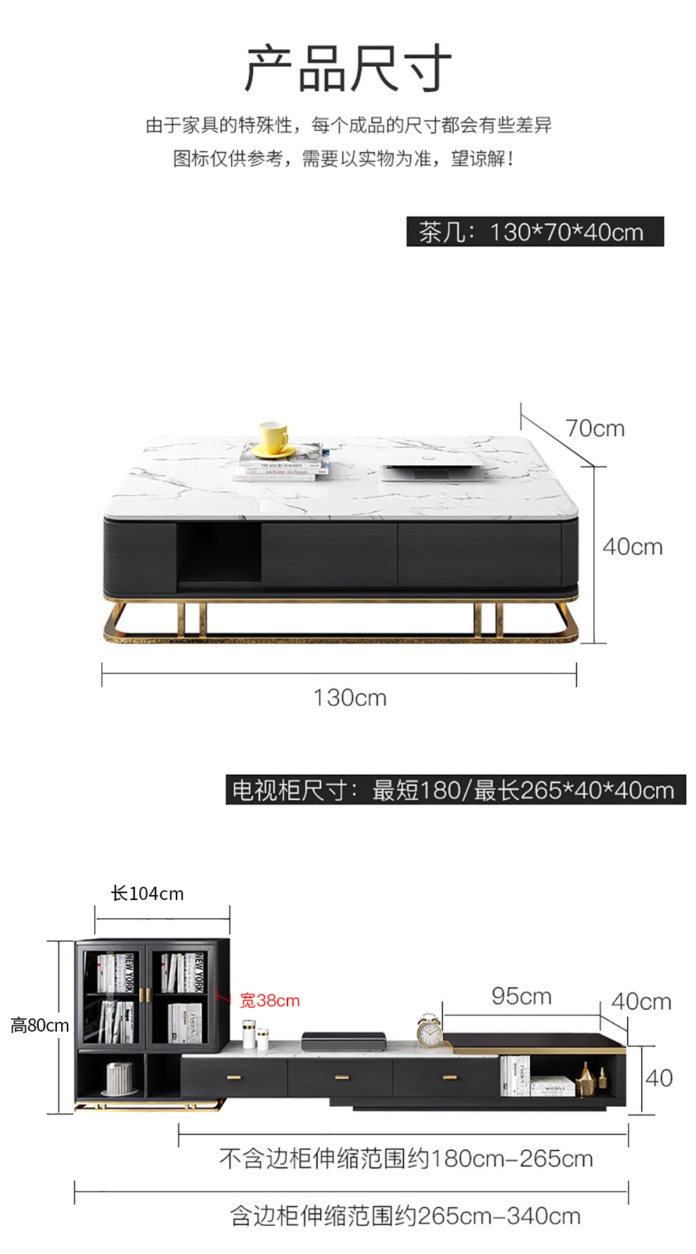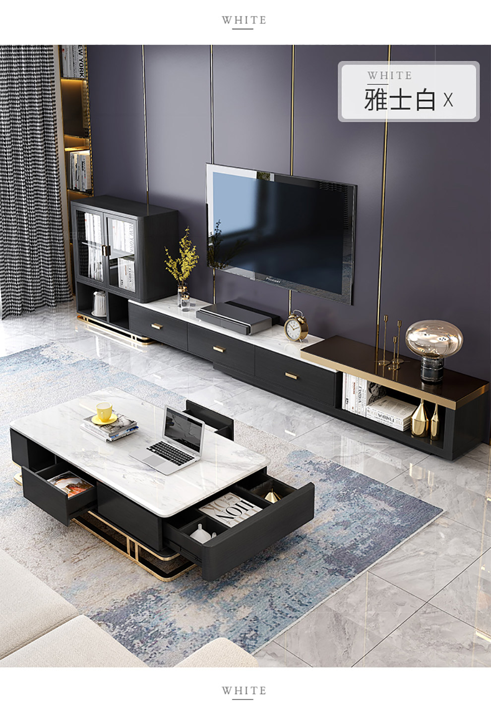 華庭茶の何意式の大理石のお茶のいくつかのテレビの箱があって、客間の大きさの戸型の軽い贅沢なステンレスの黒色のお茶のテーブル【軽い贅沢な金】はテレビの箱+お茶の何+辺の戸棚に伸縮します